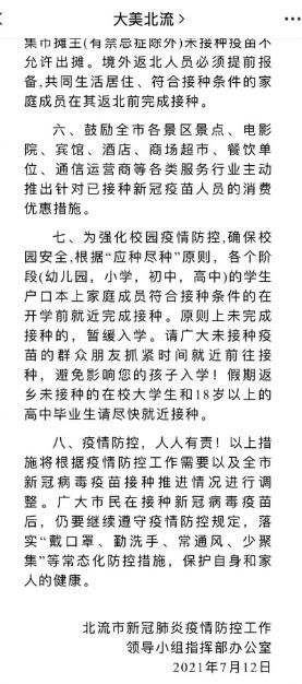 7月12日,廣西桂平市新型冠狀病毒肺炎疫情防控指揮部發(fā)出通告:凡年滿18周歲以上(戶籍不限)且無疫苗禁忌癥的人員均須接種。為強(qiáng)化校園疫情防控,確保校園安全,根據(jù)“應(yīng)種盡種”原則,各個階段(幼兒園,小學(xué),初中,高中)的學(xué)生戶口本上家庭成員符合接種條件的在開學(xué)前就近完成接種。原則上未完成接種的,暫緩入學(xué)。