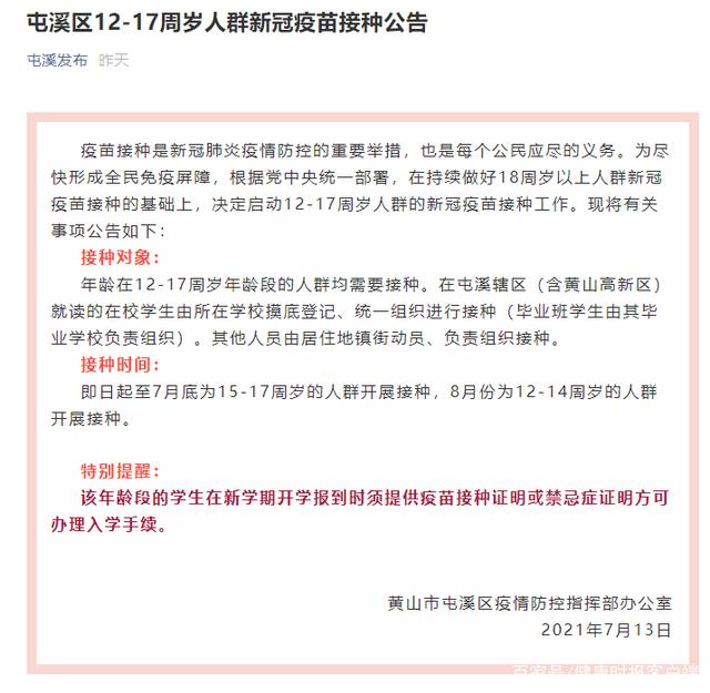7月13日,安徽省黃山市屯溪區(qū)疫情防控指揮部發(fā)布《12-17周歲人群新冠疫苗接種公告》稱,決定啟動12-17周歲人群的新冠疫苗接種工作,年齡在12-17周歲年齡段的人群均需要接種。該年齡段的學(xué)生在新學(xué)期開學(xué)報(bào)到時(shí)須提供疫苗接種證明或禁忌癥證明方可辦理入學(xué)手續(xù)。